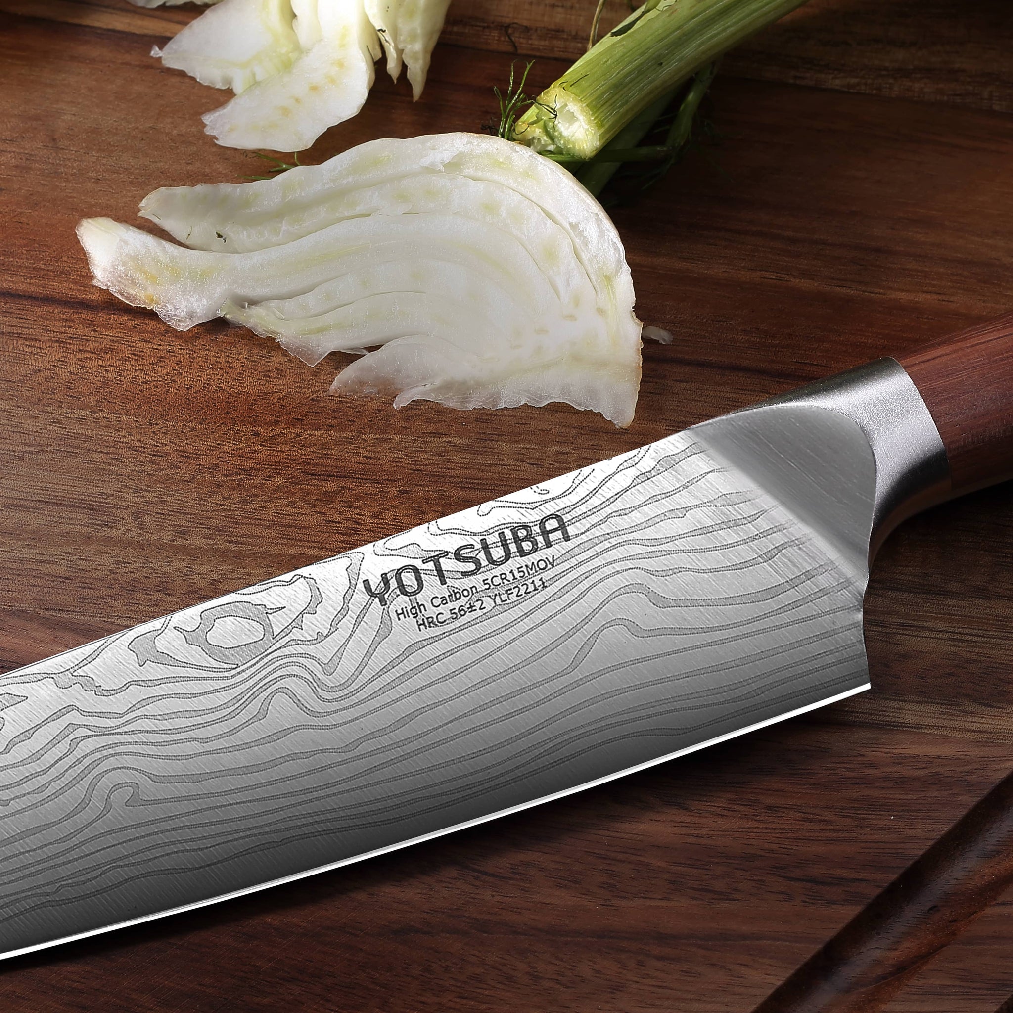 - DAMASCUS SUPER STEEL CORE - YOTSUBA kitchen knives set made from 67 layers of damascus high carbon steel, which is hammered by vacuum heat treatment. During folding and forging process, it will form very dense fine metal grains, making knives with high hardness (62HRC) and wear resistance.Ultra-thin blade ensures optimal ripeness and flavor when cutting food
