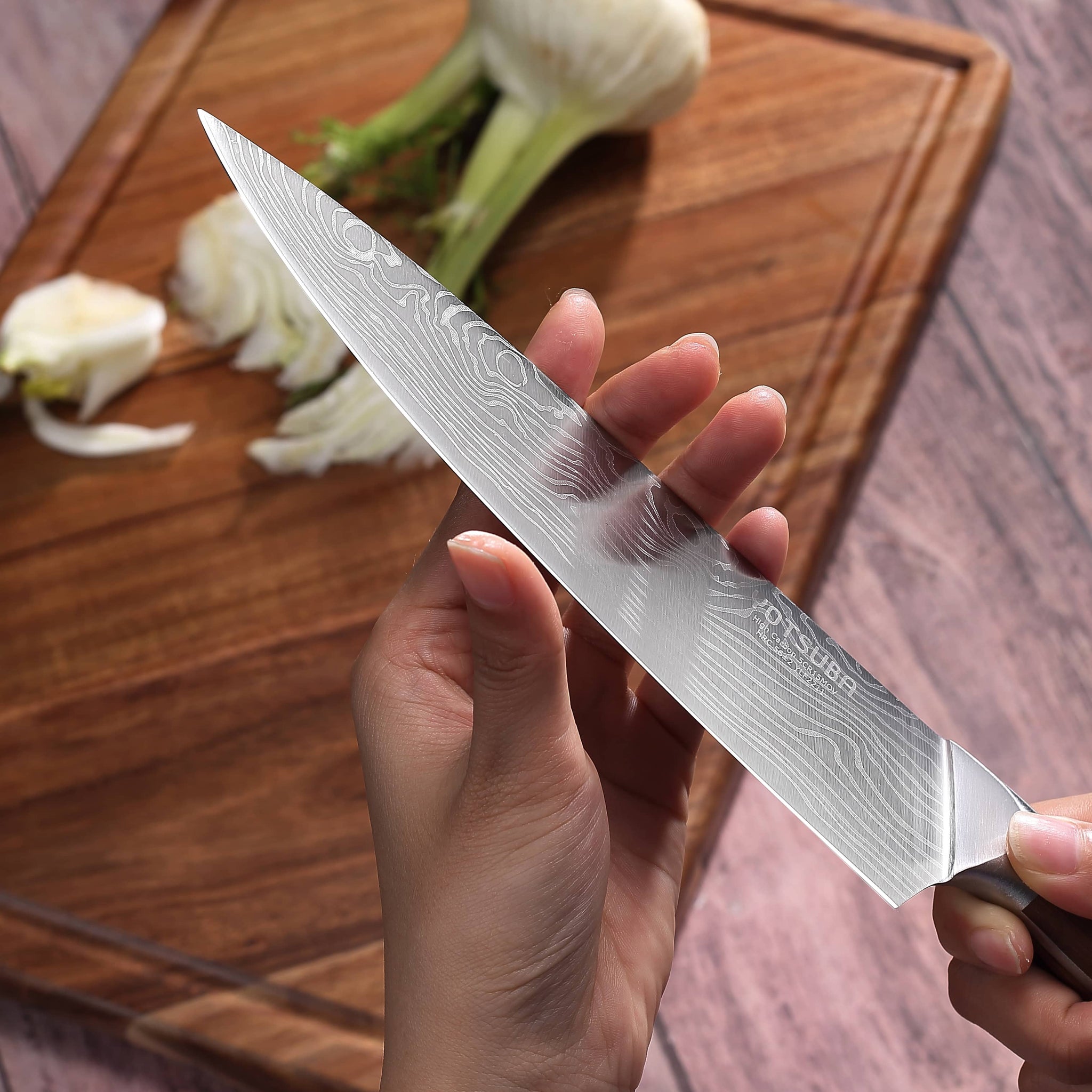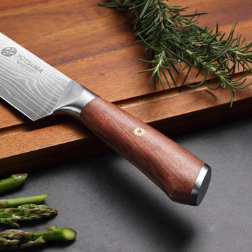 - SOLID WOOD KNIFE HANDLE-Japanese chef knives handle adopts nature olive wood which is much more durable and solider.And features an ergonomically designed octagonal balanced wood handle; minimizing wrist tension and different aspects giving you great flexibility to adjust your cutting angle; while providing a comfortable grip