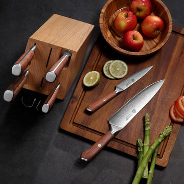 Crafted from natural rosewood for a secure, non-slip grip. Each handle features unique grain patterns, combined with a reinforced metal frame and rivets for perfect balance, comfort, and stability.