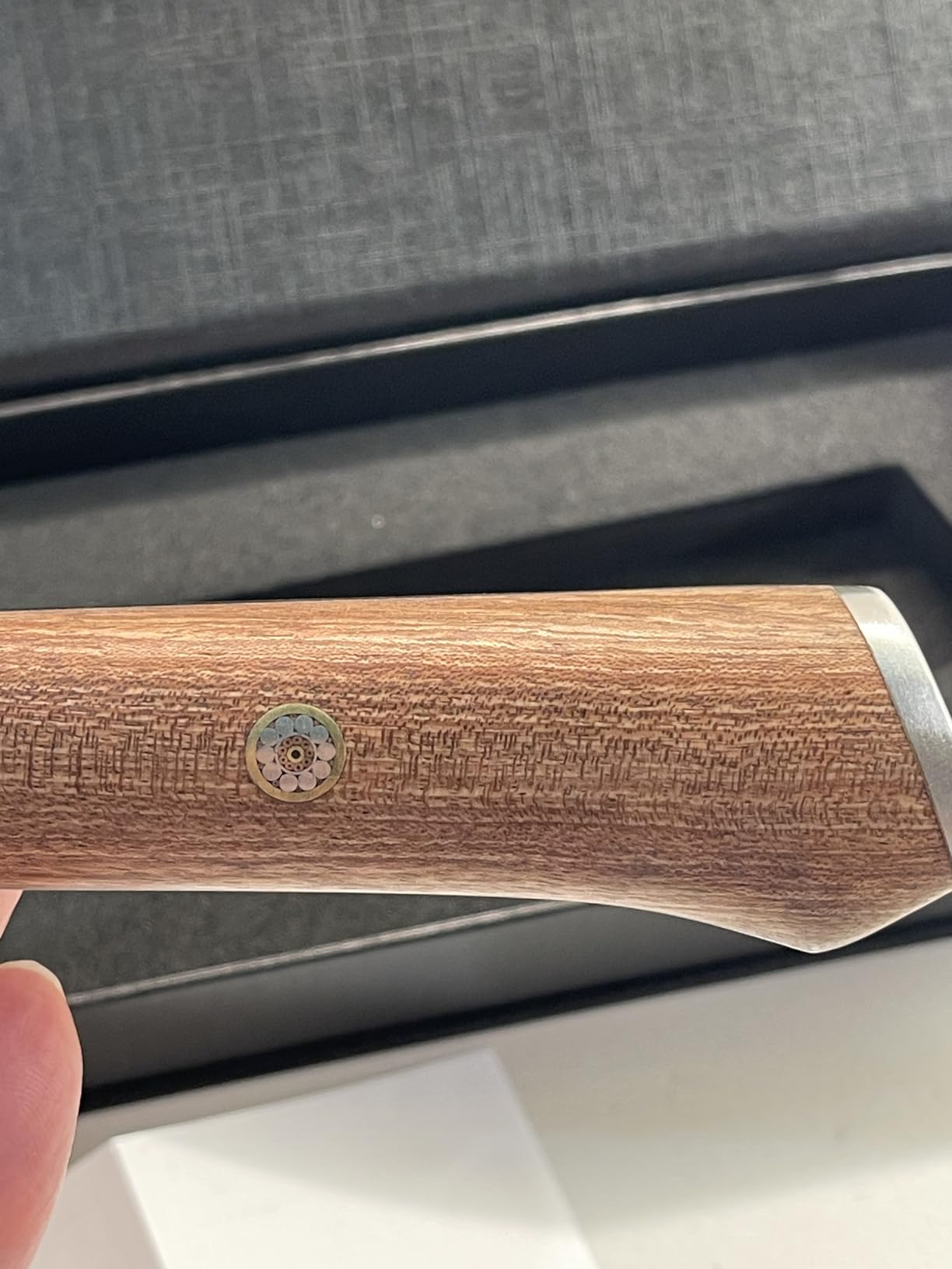 Crafted from natural rosewood for a secure, non-slip grip. Each handle features unique grain patterns, combined with a reinforced metal frame and rivets for perfect balance, comfort, and stability.